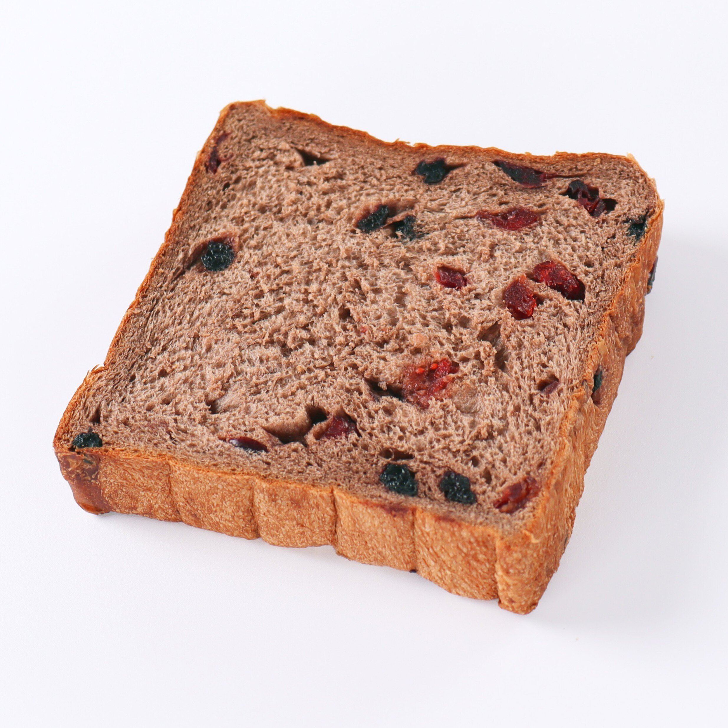 しっとりとしたチョコをベースにした生地に、洋酒に漬け込んだクランベリーとブルーベリーをたっぷりと混ぜ込んだ香り豊かな食パンです。